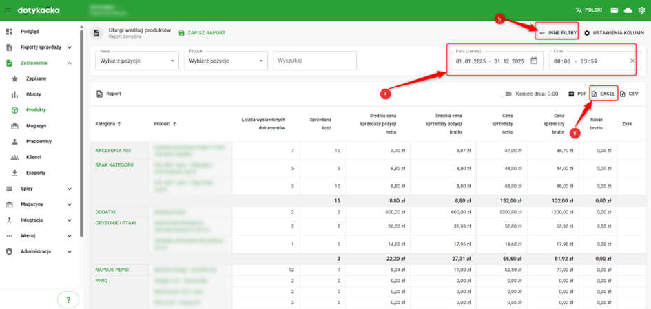 Wybieramy przedział czasowy oraz w opcji INNE FILTY wybieramy kategorię w jakiej znajdują się towary akcyzowe i klikamy klawisz "Excel".