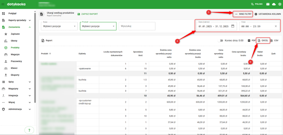 Wybieramy przedział czasowy, wybieramy czy raport ma być zrobiony z wszystkich kas czy z wybranej (jeśli mamy więcej niż jedną) oraz w filtrze INNE FILTRY wybieramy nazwę etykiety jaka była przypisana do towarów akcyzowych i klikamy klawisz "Excel".