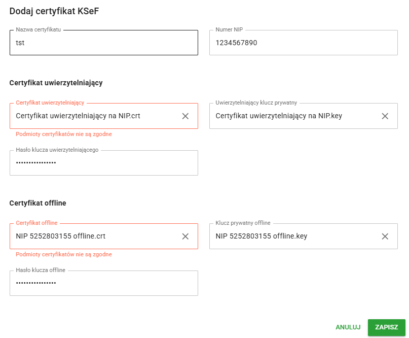 Jeśli zostaną wgrane pliki, które zawierają inne numery PESEL lub NIP zostanie wyświetlony błąd "Podmioty certyfikatów nie są zgodne":